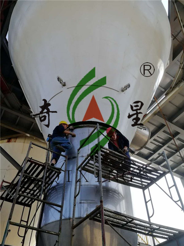 炎炎夏日,星干團隊不畏酷暑,現(xiàn)場制作安裝江西某公司訂購的聚合氯化鋁(PAC)專用噴霧干燥設(shè)備。這是二期工程,前一期已投入使用,此噴霧干燥設(shè)備將滿足客戶年產(chǎn)10000t聚合氯化鋁干燥的需求,物料脫水從含水量43.3%降至≤4%。