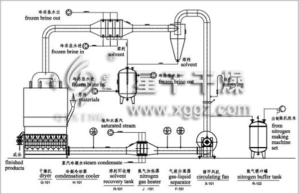 首先打開閉路循環(huán)干燥機(jī)系統(tǒng)的放空閥,對(duì)系統(tǒng)充氮?dú)猓瑢⑾到y(tǒng)中的空氣置換到預(yù)定指標(biāo)后,關(guān)閉放空閥,開啟風(fēng)機(jī)、加熱氮?dú)?、打開冷媒,使整個(gè)系統(tǒng)處于可正常投料狀態(tài),開始投料,控制停留時(shí)間,此時(shí)被蒸發(fā)的溶媒進(jìn)入冷凝冷卻器,被冷凝后變成液態(tài)進(jìn)入回收罐,不凝性的氮?dú)庵匦逻M(jìn)入風(fēng)機(jī)、再經(jīng)加熱后,進(jìn)入干燥器進(jìn)行下一輪循環(huán);嚴(yán)格控制進(jìn)、出料量的平衡,控制各點(diǎn)溫度和系統(tǒng)壓力,一旦系統(tǒng)含氧值超標(biāo),氮?dú)饩蜁?huì)自動(dòng)補(bǔ)充,壓力超標(biāo)泄壓閥會(huì)自動(dòng)打開,同時(shí)伴有報(bào)警裝置,由PLC程序自動(dòng)控制,自動(dòng)調(diào)試各參數(shù)到正常范圍,并定時(shí)定周期進(jìn)行清灰。如此循環(huán),實(shí)現(xiàn)連續(xù)生產(chǎn),達(dá)到干燥物料、回收溶媒的目的。由于溶媒均是易燃、易爆,所以整個(gè)系統(tǒng)均為防爆,并設(shè)有泄爆口和防爆膜,確保裝置的安全,確保操作工人的人身安全。
